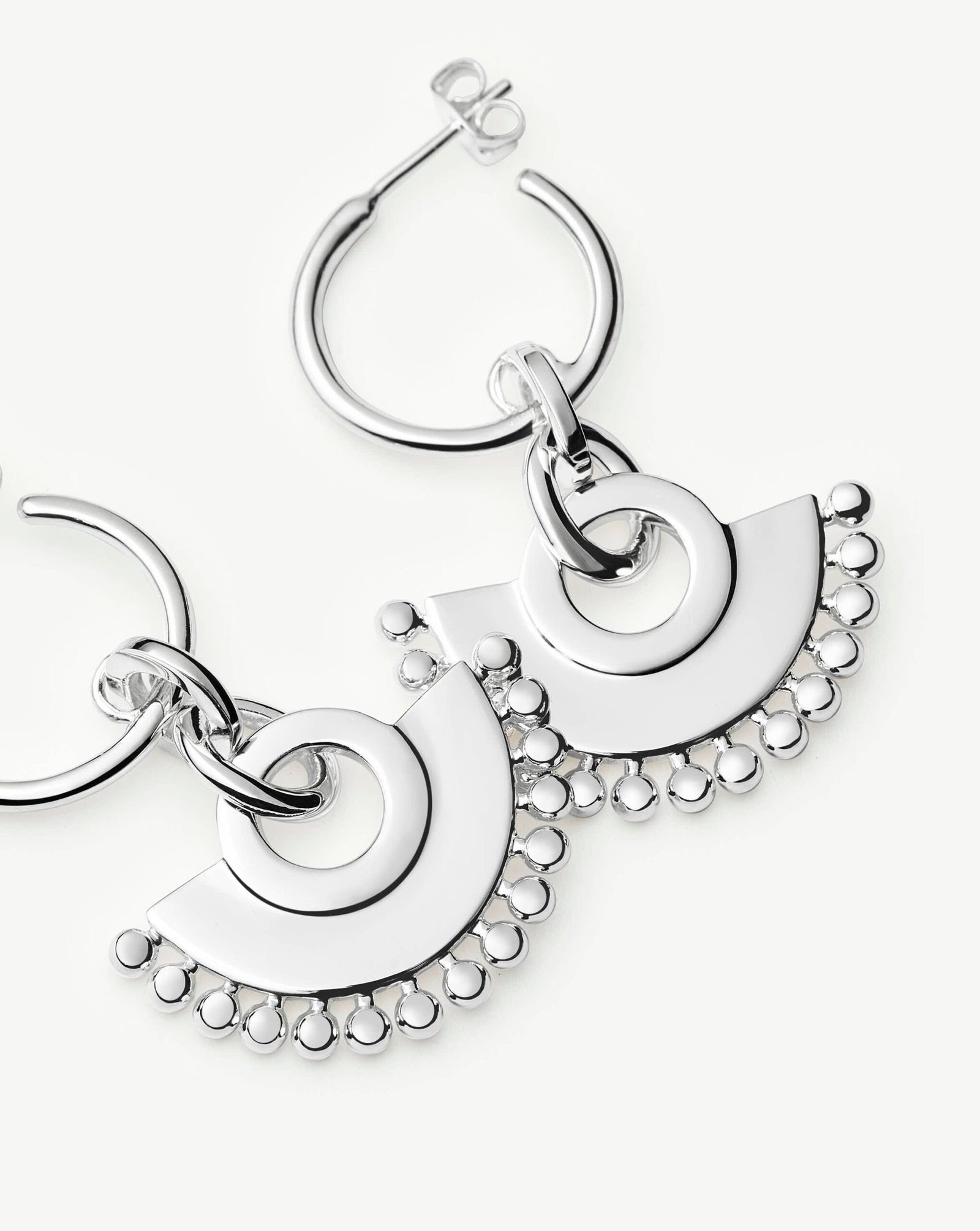 Our best selling Zenyu Fan Chandelier Earrings now available in silver. These everyday statement hoops are inspired by Colombia and feature bobble-trimmed charms suspended from delicate hoops. Add to your ear stack with chunky silver huggies or studs.